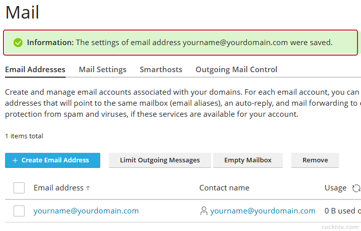 Plesk will confirm that the email account’s outgoing email limit has been updated successfully.