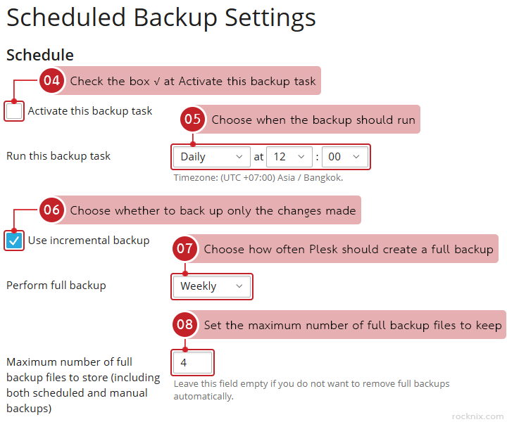 - Run this backup task: choose when the backup should run. Plesk allows you to schedule backups daily, weekly, or monthly, and you can also specify the exact time, such as 12:00 AM or any other preferred hour.