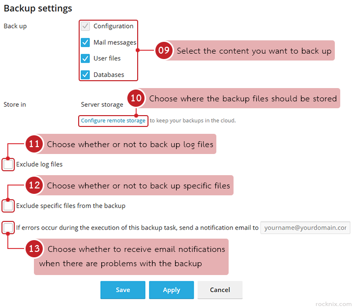 - If errors occur during the execution of this backup task, send a notification email to: enable this option if you want Plesk to send an email notification whenever a backup fails or encounters an issue. Enter the destination email address that should receive the alert.