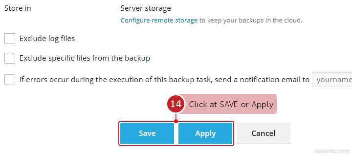 - Exclude log files: enable this option if you do not want log files to be included in the backup.